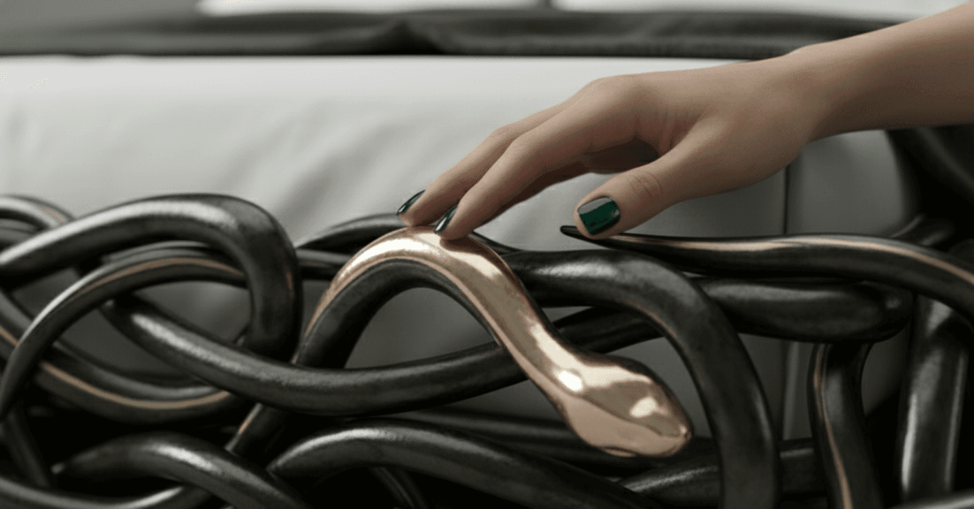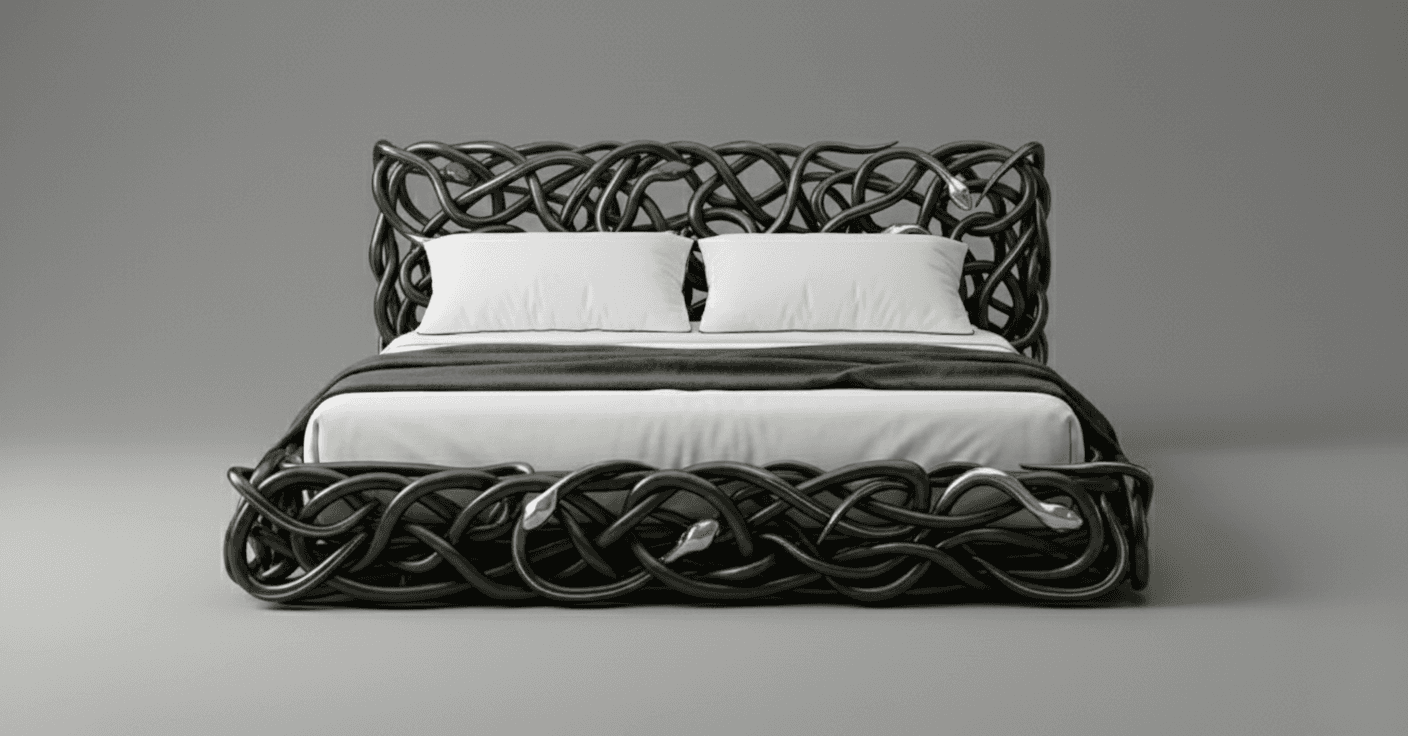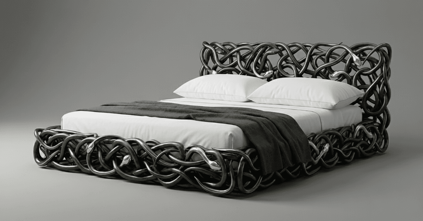 Drawing from Apep, the ancient Egyptian embodiment of chaos, Apep’s Entwine Bed reconceives the primordial serpent as monumental ceremonial architecture. Intertwined bronze forms coil and converge to define the bed’s structure, their tensioned bodies articulated through sinuous curves, overlapping scales, and flared hoods. Cast using the lost-wax technique and finished in deep matte gunmetal, the surface is punctuated by restrained 18K gold PVD accents at the eyes, fangs, and hoods. Both protective and confrontational, the work positions rest within a charged sculptural embrace—an heirloom-scale object where mythic conflict is rendered as controlled luxury.