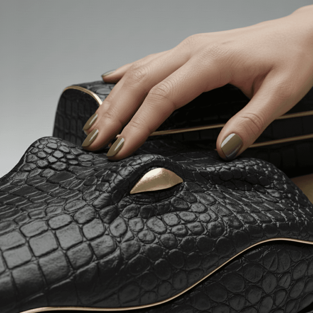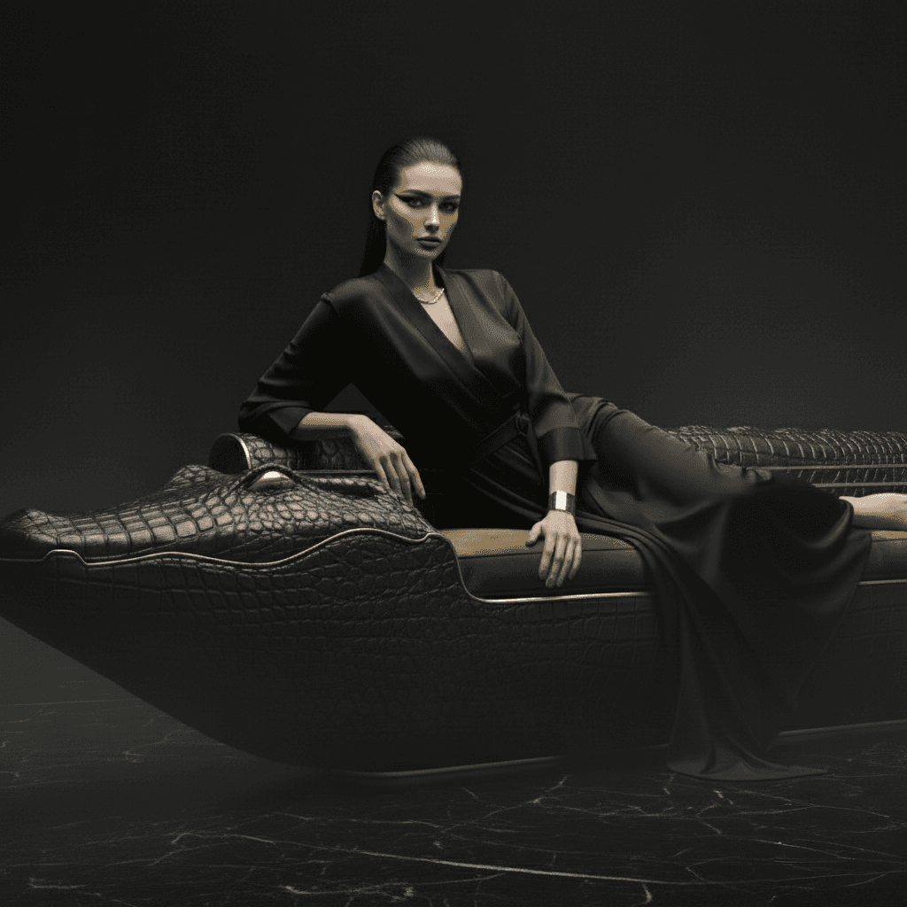 Inspired by Sobek, the ancient Egyptian god of the Nile and embodied power, the Croco du Nil Sculptural Lounge reinterprets the crocodile’s armored anatomy as an elongated chaise. Scaled textures, calibrated gold ocular details, and a subtly articulated maw are abstracted into a controlled, ceremonial form. Upholstered in obsidian-black crocodile-embossed leather with restrained 18K gold PVD accents, the work balances latent menace with material refinement. A concealed steel structure and sculpted high-density foam core produce unexpected ergonomic depth, positioning the piece as a convergence of mythic symbolism, contemporary fabrication, and collectible design.