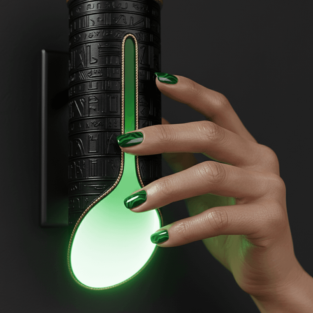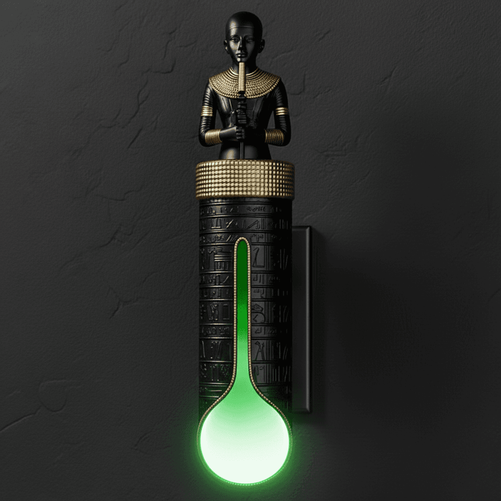 Drawing from Ptah, the Egyptian god of creation and divine architecture, this sculptural wall sconce renders the mummiform figure as a disciplined bronze volume. Solid-cast and finished in matte Abyssal Noir, the form is articulated with restrained 18K gold accents across the collar, armbands, and architectural registers. A hand-crafted ombré glass diffuser—shifting from emerald green to luminous white—directs a controlled downward illumination. Fully dimmable LED lighting is integrated with material rigor and precision fabrication, positioning the work as both functional light source and ceremonial wall architecture.