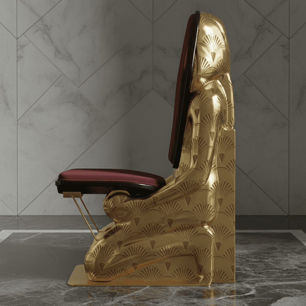 Inspired by the shrine-bearing pastophori of ancient Egyptian temples, Pastophorus Prime is conceived as a collectible sculptural throne. A kneeling humanoid base—cast in marine-grade aluminum and finished in luminous 18K gold electroplate—is articulated with Art Deco fan reliefs, referencing veiled sanctuaries and ceremonial procession. Upholstered cushions in plush mohair crown the form, offering calibrated comfort against its ritual gravity. Discreet, integrated library storage is concealed within the rear structure, reinforcing themes of guarded knowledge and elevation. Positioned as a limited-edition artifact, Pastophorus Prime exists at the intersection of myth, architecture, and high-jewelry furniture.